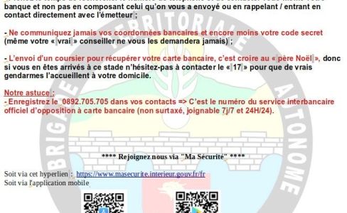 En raison de la recrudescence du phénomène des faux conseillers/courtiers bancaires, les services de la gendarmerie mettent en garde les usagers. Plus d'informations en consultant le fichier joint ou sur https://www.masecurite.interieur.gouv.fr/fr