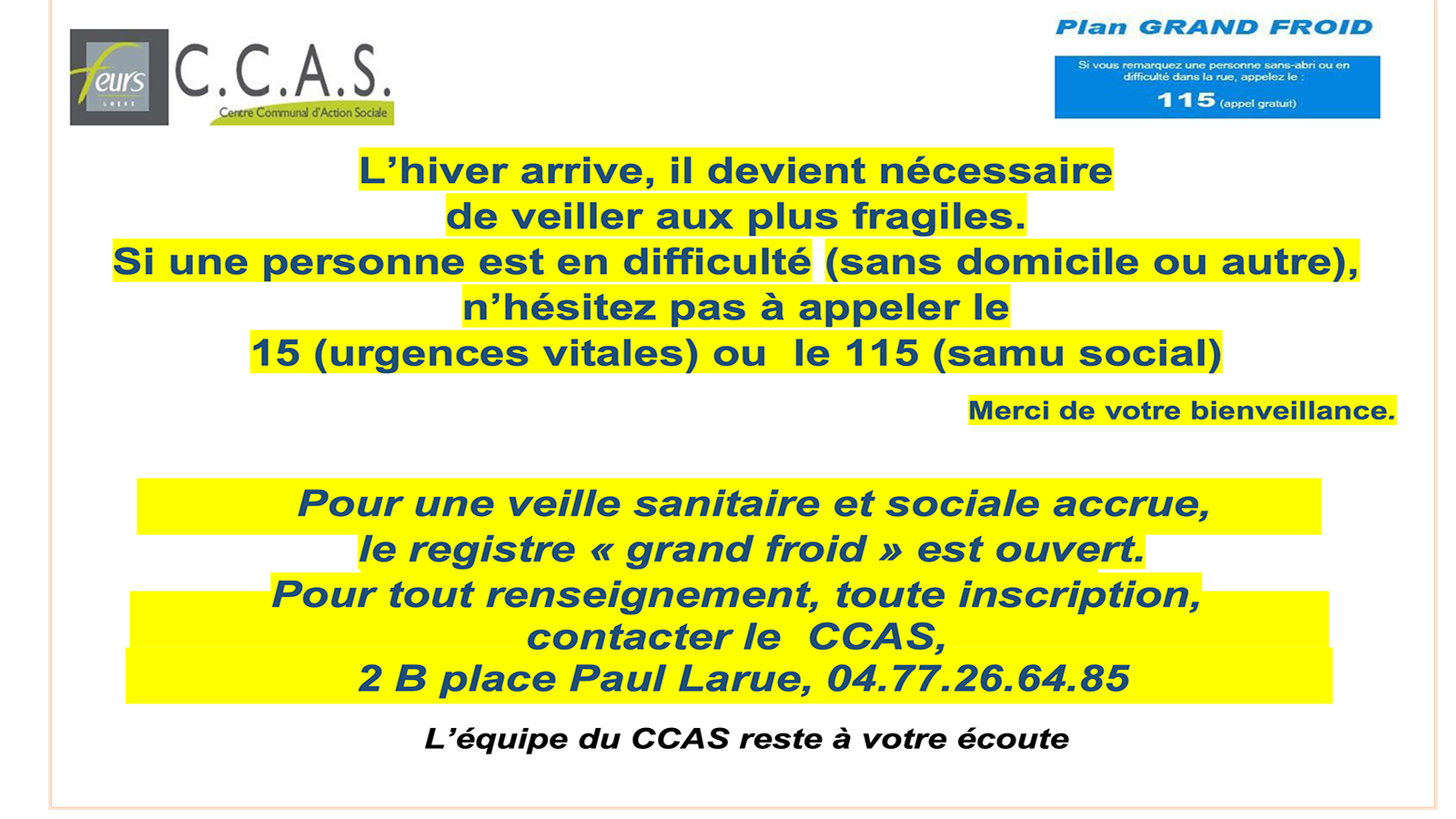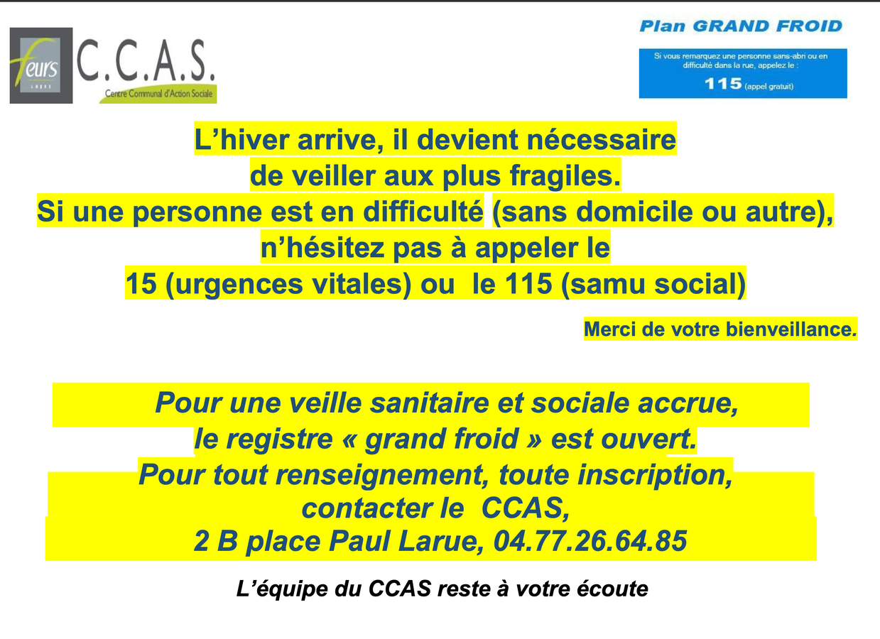 Le CCAS de Feurs communique : "Pour une veille sanitaire et sociale accrue, le registre ''grand froid'' est ouvert."Renseignements et inscriptions au CCAS, 2B place Paul Larue.Tél. 04 77 26 64 85